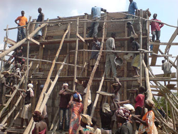In Nnudu lautet die Devise "Mit handfestem Einsatz zum vollen Erfolg!" Lothar Ortmann, gelernter Physiker und technisch versiert, setzte sich daran, die Planungen und Berechnungen zum Bau des Wasserreservoirs durchzuführen. Die meisten Fähigkeiten und die körperliche Kraft zur Umsetzung brachten die Dorfbewohner selbst ein. Das Vorgehen und die Beschaffung der Materialien wurden jeweils flexibel abgesprochen und gemeinsam erledigt. Täglich wechselnde Arbeitsgruppen von ca. 20 Männern und bei Transportbedarf auch Frauen leisteten die schwere körperliche Arbeit bei afrikanischer Hitze. Die größte Knochenarbeit im wahrsten Sinne des Wortes bestand daraus, die zahlreichen großen Felsbrocken und Steine von der Anhöhe oberhalb des Dorfes zu entfernen, die die Plattform für das Wasserreservoir bildet. Alle - vom Kind bis zum Dorfältesten - halfen nach besten Kräften mit. Gräben wurden gezogen, um die Wasserrohre zu verlegen. Schon im ersten Jahr hatten die Dorfbewohner so mit den vom Verein eingekauften Materialien ihre erste funktionierende Trinkwasserversorgung geschaffen. Und das ohne jegliche Maschinen, wenn man von der Wasserpumpe absieht. Eine Außentreppe führt jetzt an dem großen Wasserbehälter hoch, der die zwei provisorischen Kunststofftanks ersetzt. Das Wasser für dieses Reservoir stammt aus einem Brunnen, von dem das Wasser in den großen Behälter wie in einem Wasserturm hochgepumpt wird. Von dort läuft das kostbare Nass in einem natürlichen Gefälle über flexible Rohre zu den elf Zapfstellen im Dorf, die bequem mit einem Wasserhahn zu bedienen sind. Marianne stellt bei ihren regelmäßigen Besuchen erfreut fest, dass die Bewohner die Anlage gewissenhaft in Stand halten und pflegen.